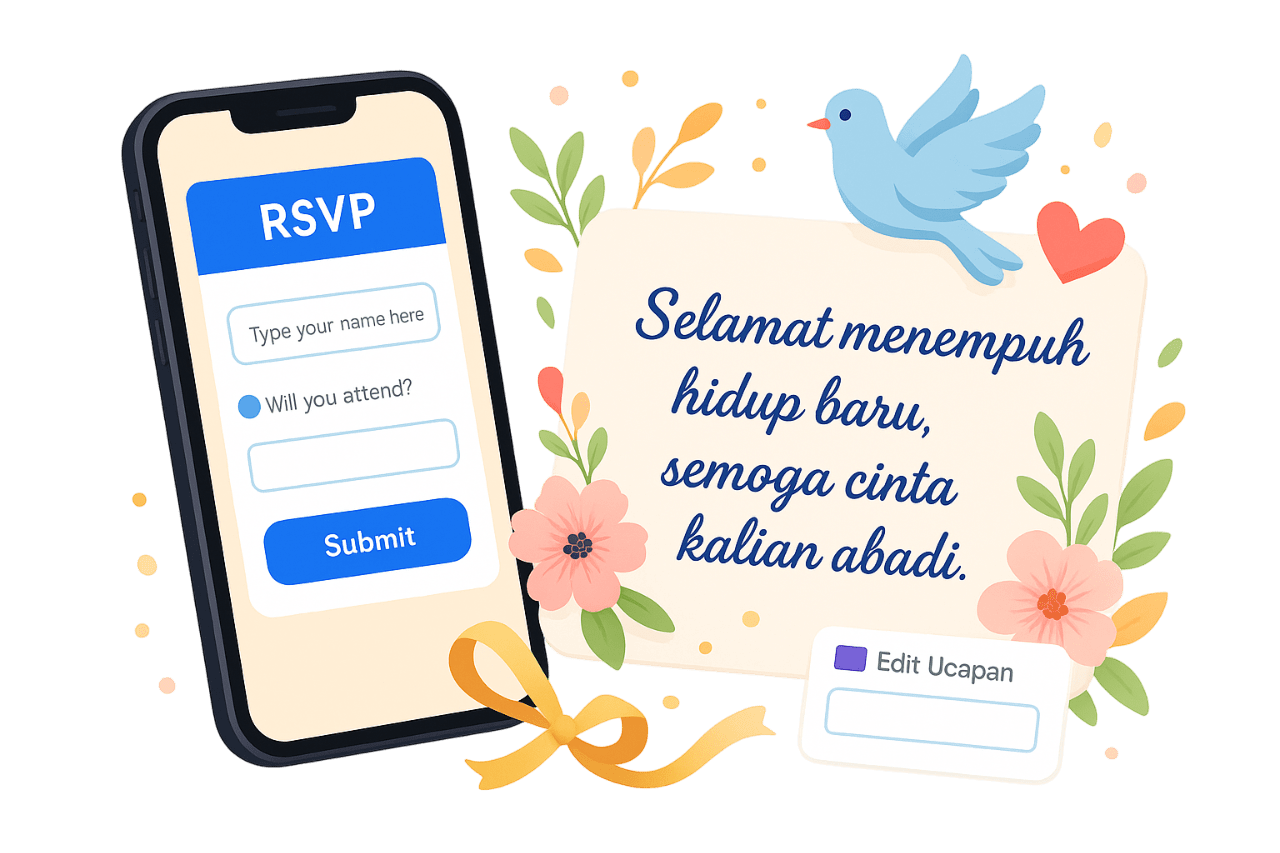 Fitur RSVP memungkinkan tamu memberikan konfirmasi kehadiran langsung dari link undangan. Selain itu, mereka juga bisa meninggalkan pesan, doa, atau ucapan spesial untuk kamu.